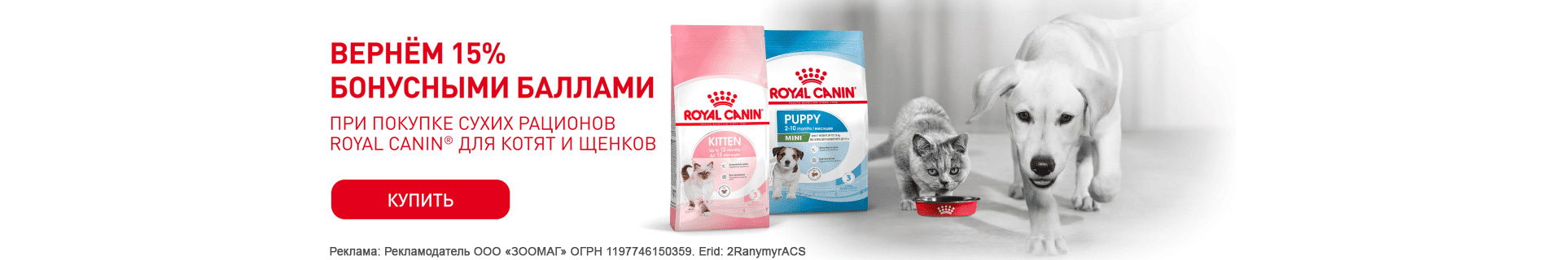 Вернем 15% бонусными баллами при покупке выделенного ассортимента сухих кормов Royal Canin для котят и щенков!