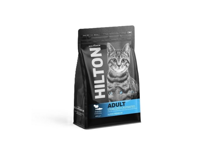 Полнорационный корм Hilton для стерилизованных кошек и кастрированных котов с индейкой и лососем.