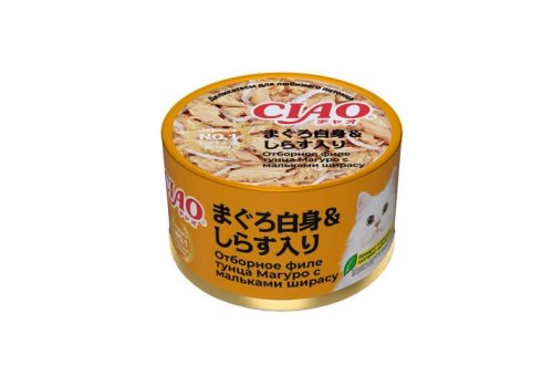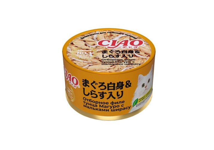 Супер-премиальный влажный корм для кошек CIAO can (ЧАО КЭН) от японского производителя Inaba приготовлен на основе кусочков мяса глубоководного тунца Магуро с имальками ширасу. Внутри упаковки ароматные нежные волокна в желе, которые подойдут даже самым привередливым кошкам и кошкам с чувствительным пищеварением.