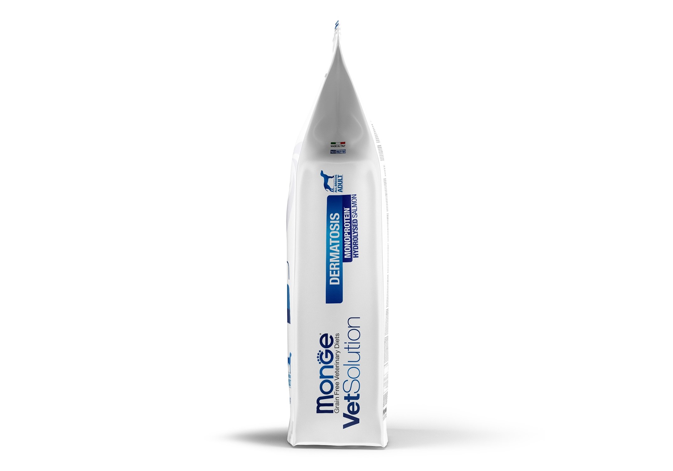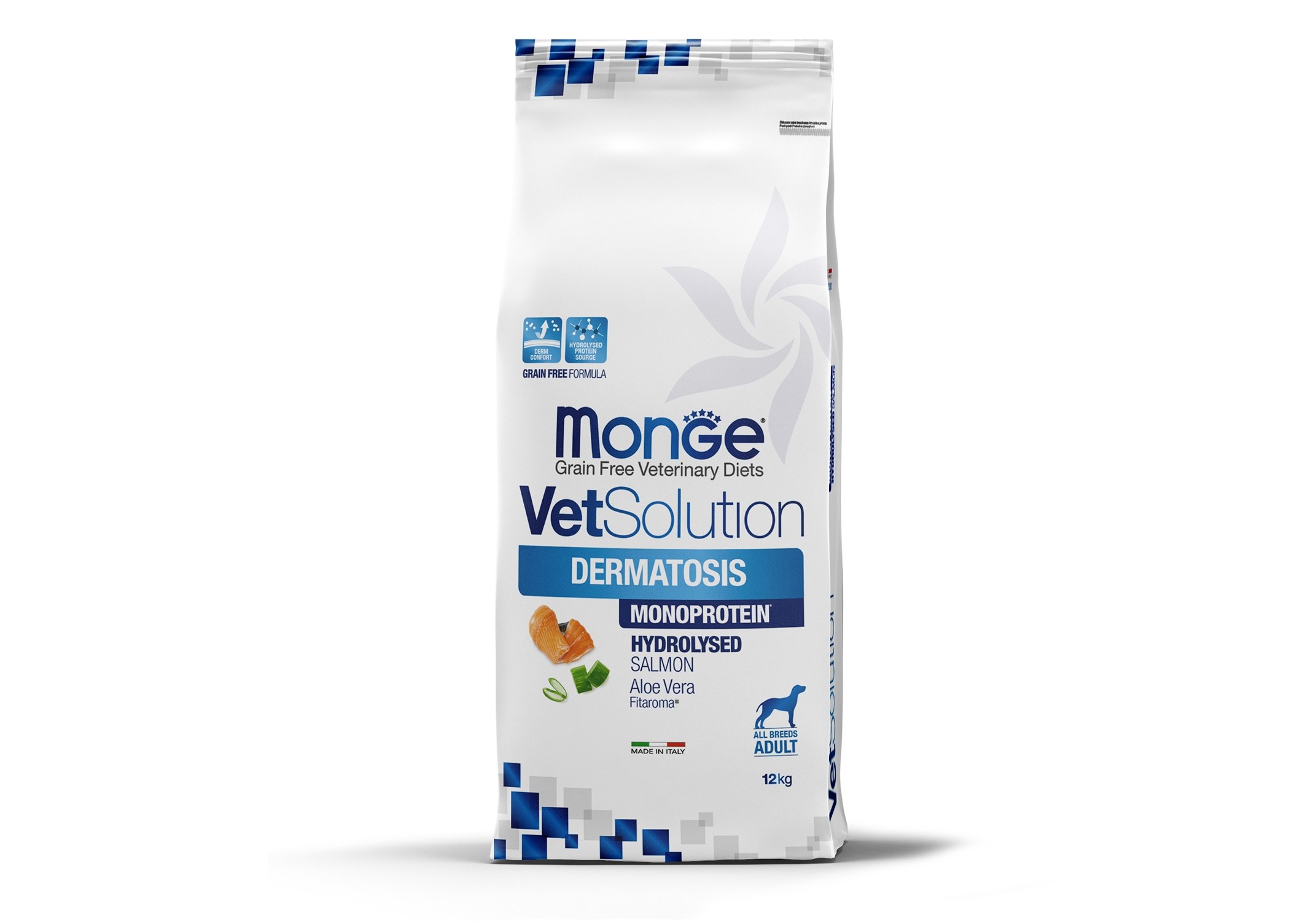 Monge (Монж/Монже) VetSolution Dermatosis - полнорационный сухой диетический корм из лосося для собак «DERMATOSIS» для восстановления функций кожи при дерматологических заболеваниях и избыточном выпадении шерсти у собак. Содержит концентрат сока дыни для нейтрализации свободных радикалов. Fit-aroma: Aloe verа - алоэ вера для поддержки здоровья кожи, ксилоолигосахариды (XOS) для защиты микробиоты кишечника и высокий уровень незаменимых жирных кислот линоленовой (LA) и сочетание эйкозапентаеновой (EPA) и докозагексаеновой (DHA).Состав: Гидролизованный белок лосося (23%), сушеный горох, тапиока, картофель, животный жир (утиный жир)*, клетчатка гороха, животный жир (куриный жир)*, рыбий жир (лососевый жир)*, порошок семян рожкового дерева, минеральные вещества, пивные дрожжи, ксилоолигосахариды (XOS 0,4%), алоэ вера (0,06%), продукты и субпродукты переработки свежих фруктов и овощей (концентрат сока дыни (Cucumis melo cantalupensis) источник супероксиддисмутазы 0,005%).