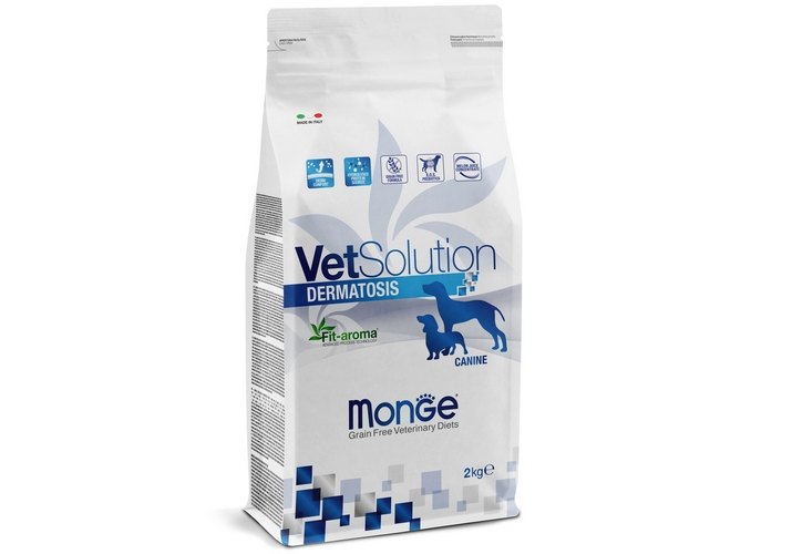 Monge (Монж/Монже) VetSolution Dermatosis - полнорационный сухой диетический корм из лосося для собак «DERMATOSIS» для восстановления функций кожи при дерматологических заболеваниях и избыточном выпадении шерсти у собак. Содержит концентрат сока дыни для нейтрализации свободных радикалов. Fit-aroma: Aloe verа - алоэ вера для поддержки здоровья кожи, ксилоолигосахариды (XOS) для защиты микробиоты кишечника и высокий уровень незаменимых жирных кислот линоленовой (LA) и сочетание эйкозапентаеновой (EPA) и докозагексаеновой (DHA).Состав: Гидролизованный белок лосося (23%), сушеный горох, тапиока, картофель, животный жир (утиный жир)*, клетчатка гороха, животный жир (куриный жир)*, рыбий жир (лососевый жир)*, порошок семян рожкового дерева, минеральные вещества, пивные дрожжи, ксилоолигосахариды (XOS 0,4%), алоэ вера (0,06%), продукты и субпродукты переработки свежих фруктов и овощей (концентрат сока дыни (Cucumis melo cantalupensis) источник супероксиддисмутазы 0,005%).