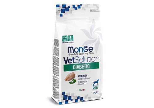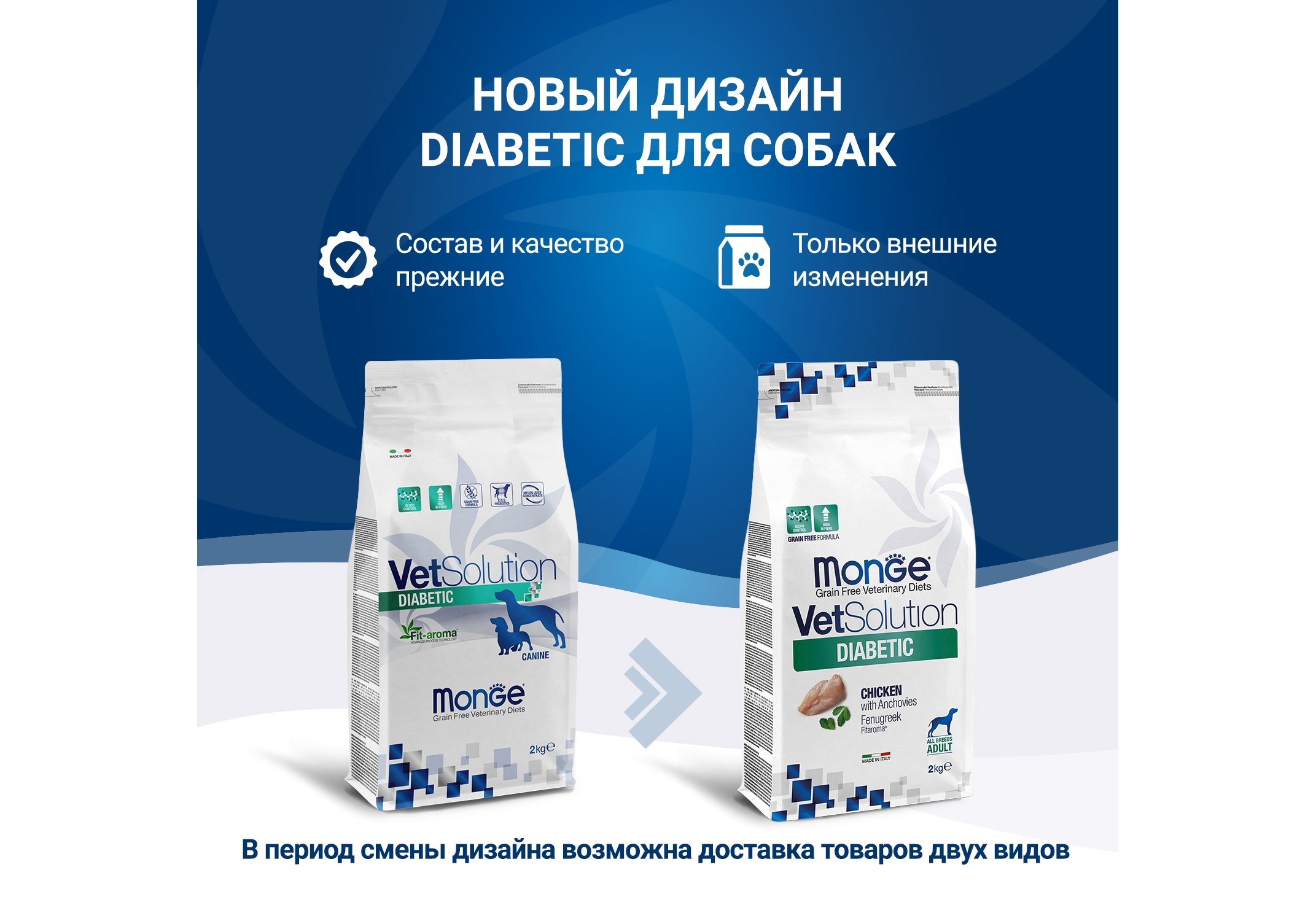 Monge (Монж/Монже) VetSolution Diabetic Canine — полнорационный сухой диетический корм из курицы для собак «Diabetic» для контроля поступления глюкозы (при сахарном диабете) у собак. Содержит концентрат сока дыни для нейтрализации свободных радикалов, пажитник с гипогликемическим действием, ксилоолигосахариды (XOS) для защиты кишечной микробиоты. Формула характеризуется низким уровнем моно- и дисахридов.Состав: Дегидрированное мясо курицы, тапиока (20%)**, картофель (14%)**, клетчатка гороха, дегидрированная рыба (анчоус), сухое яйцо, рыбий жир (лососевый жир)*, дегидрированное мясо утки, пивные дрожжи, минеральные вещества, животный жир (куриный жир)*, ксилоолигосахариды (XOS 0,4%), семена пажитника (0,15%), продукты и субпродукты обработки свежих фруктов и овощей (концентрат сока дыни (Cucumis melo cantalupensis) источник супероксиддисмутазы 0,005%), сухой молочный белок.