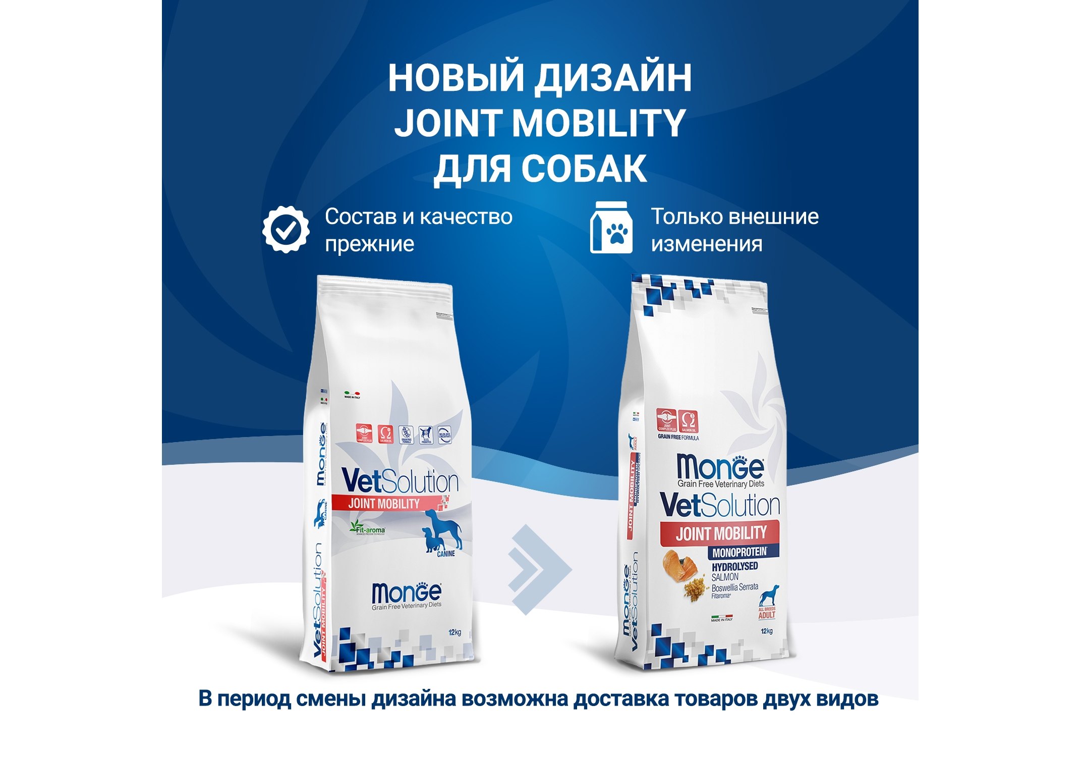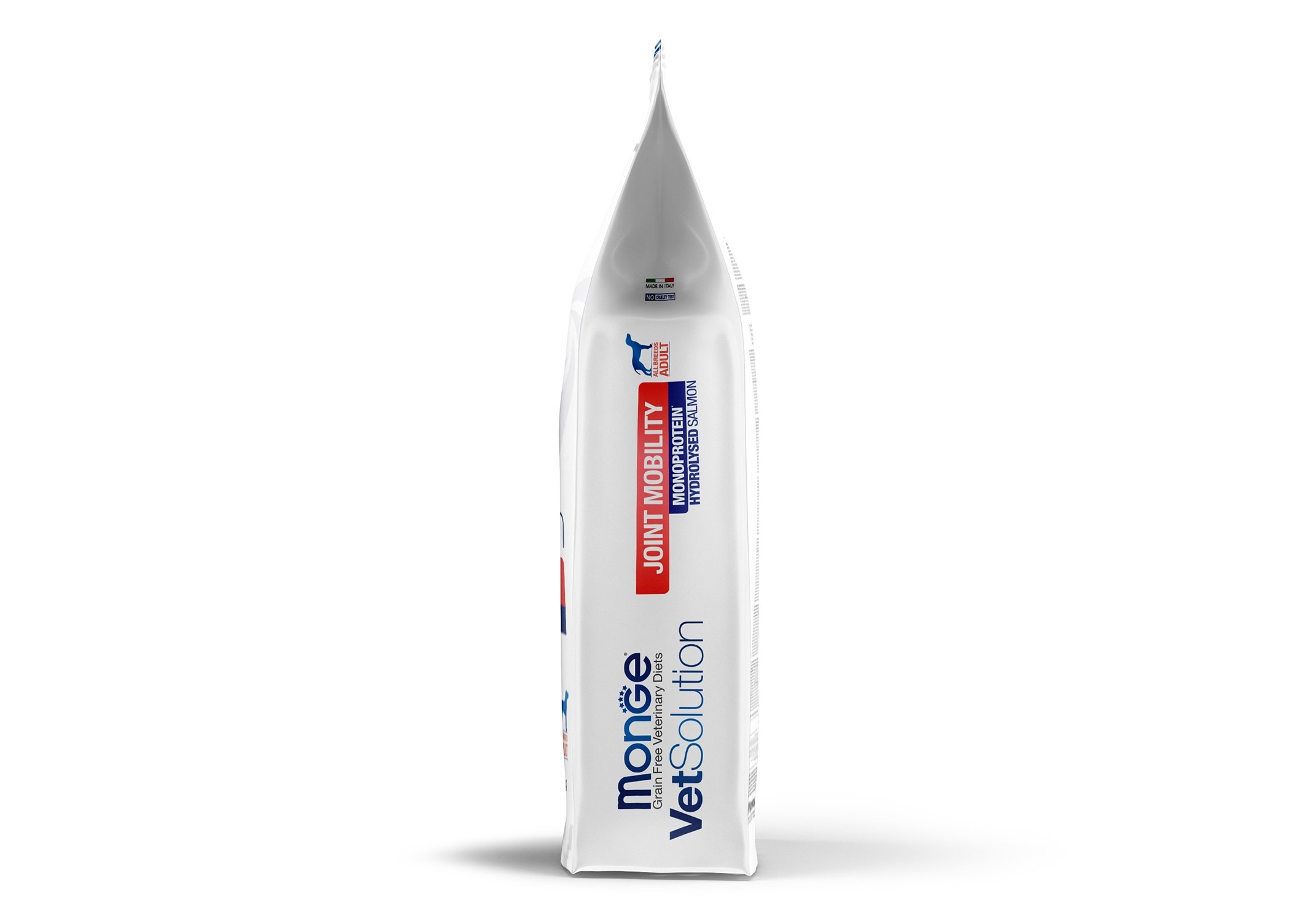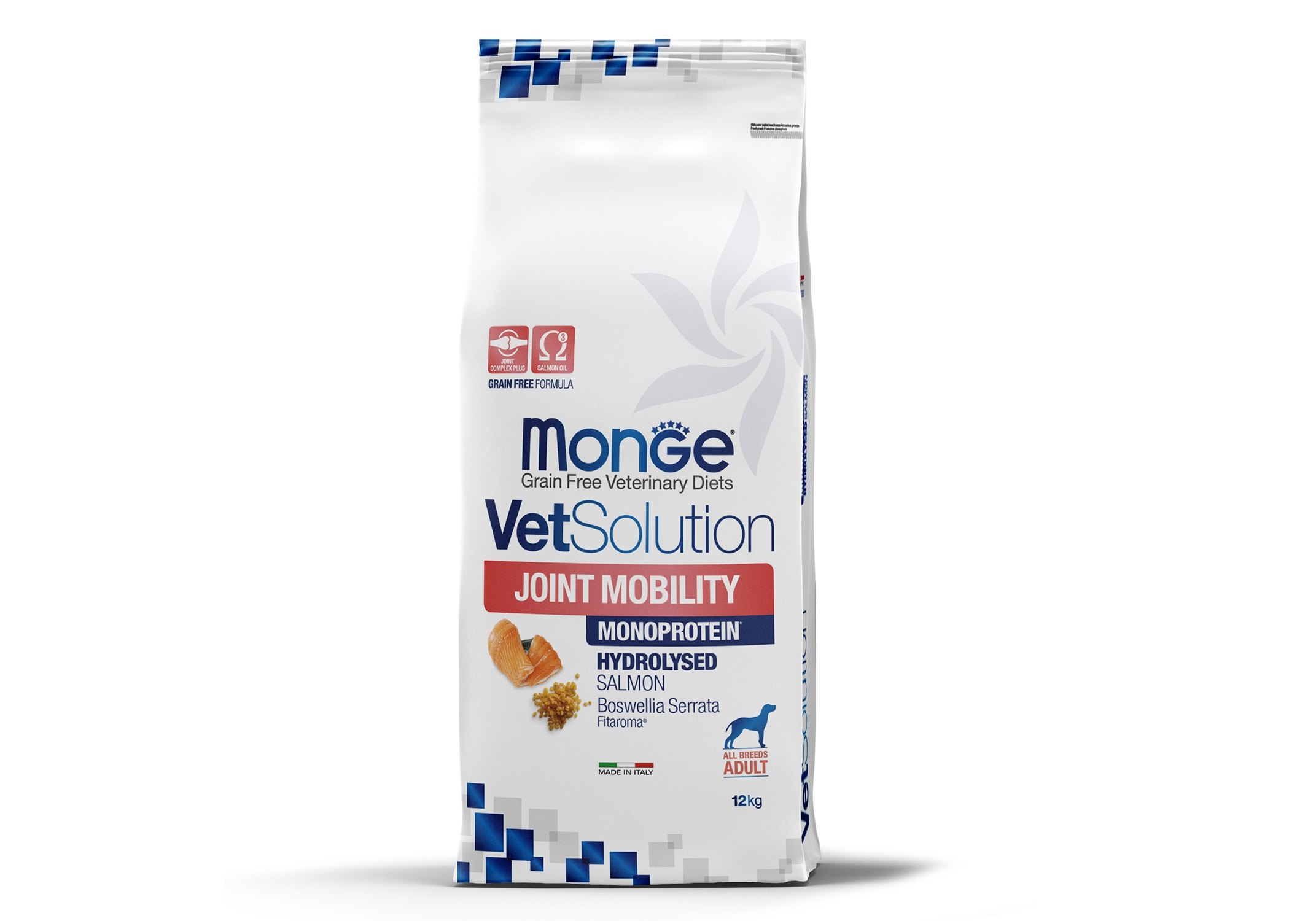 Monge (Монж/Монже) VetSolution Joint Mobility — полнорационный сухой диетический корм из лосося для щенков и взрослых собак «Joint Mobility » для поддержания метаболизма суставов при остеоартрите у собак. Содержит концентрат сока дыни нейтрализации свободных радикалов. Fit-aroma: босвеллию для поддержки суставов, ксилоолигосахариды (XOS) для защиты кишечной микробиоты. Формула характеризуется общим уровнем омега-3 жирных кислот и эйкозапентаеновой кислоты (EPA) и оптимальным уровнем витамина E.Состав: Гидролизованный белок лосося, тапиока, картофель, рыбий жир (лососевый жир 7%)*, животный жир (утиный жир)*, сухая свекольная пульпа, гидролизованный животный белок, минеральные вещества, пивные дрожжи, гороховая клетчатка, ксилоолигосахариды (XOS 0,4%), продукты переработки растений (босвеллия (Boswellia serrata) 0,23%), глюкозамин (0,057%), хондроитина сульфат (0,04%), продукты и субпродукты переработки свежих фруктов и овощей (концентрат сока дыни (Cucumis melo cantalupensis) источник супероксиддисмутазы 0,005%). *очищенный на 99,6%, консервированный с помощью натуральных антиоксидантов.