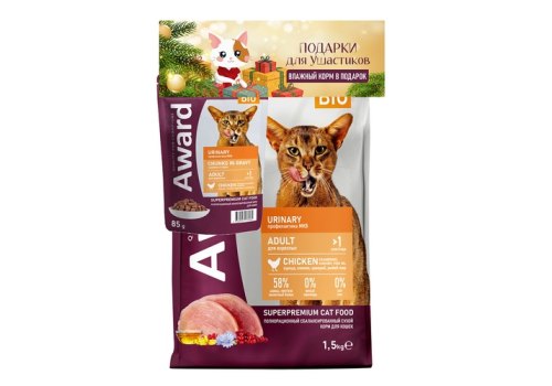 Новогодний набор Сухой корм AWARD Urinary для взрослых кошек с курицей + влажный корм AWARD Urinary кусочки в соусе с курицей В ПОДАРОК.Выгодное и вкусное предложение для кошек для счастливых моментов вместе!