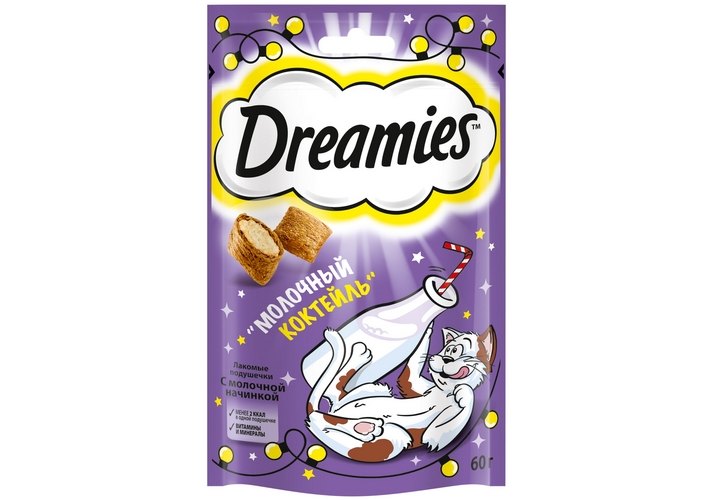 Новогоднее лакомство DREAMIES «Молочный коктейль», станет особенным подарком для Вашего кота! Он ждет новогоднюю ночь не меньше Вас: можно будет не спать до утра, мяукать под куранты, шуршать оберточной бумагой и, конечно, попробовать свой подарок - DREAMIES «Молочный коктейль»! Новинка от DREAMIES не оставит равнодушным вашего питомца благодаря следующим преимуществам: