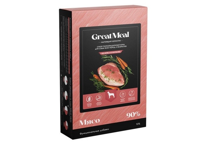 Great Meal - это инновационный холистик корм для собак всех пород, разработанный по природным потребностям питомца. Основа рациона - до 90% мясных ингредиентов: свежее мясо индейки, субпродукты и овощи, включая морковь. Корм не содержит злаков, глютена, ГМО и искусственных добавок - только натуральные, гипоаллергенные компоненты.