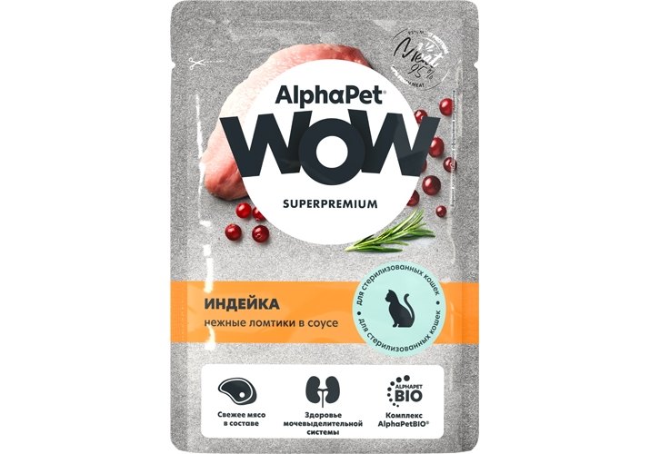 AlphaPet Wow Superpremium Влажный корм АльфаПет для взрослых стерилизованных кошек нежные ломтики индейки в соусе (цена за упаковку) 85г х 28шт