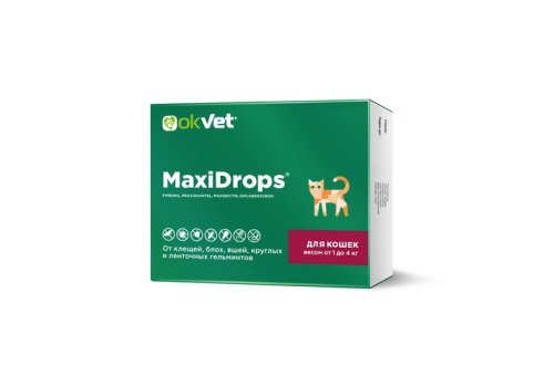 МаксиДропс® назначают взрослым кошкам и котятам для лечения и профилактики ассоциативных паразитарных заболеваний, вызываемых блохами, иксодовыми клещами, вшами, чесоточными и тромбидиформными клещами, нематодами и цестодами, для профилактики дирофиляриоза, вызываемого личинками Dirofilaria immitis и Dirofilaria repens, а также снижения риска заражения бабезиозом и боррелиозом, переносчиками которых являются иксодовые клещи.