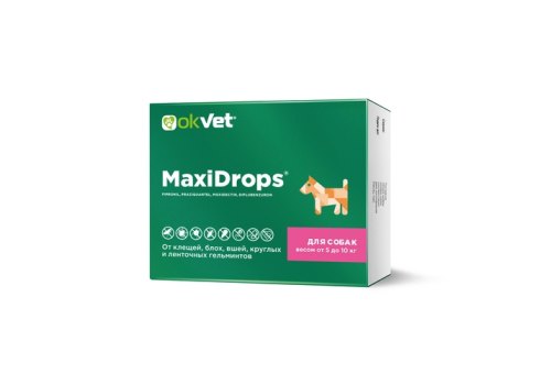 МаксиДропс® назначают взрослым собакам и щенкам для лечения и профилактики ассоциативных паразитарных заболеваний, вызываемых блохами, иксодовыми клещами, вшами, чесоточными и тромбидиформными клещами, нематодами и цестодами, для профилактики дирофиляриоза, вызываемого личинками Dirofilaria immitis и Dirofilaria repens, а также снижения риска заражения бабезиозом и боррелиозом, переносчиками которых являются иксодовые клещи.