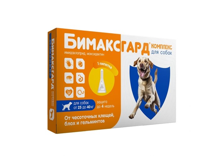 Бимаксгард КОМПЛЕКС для собак 25-40 кг - современный комбинированный противопаразитарный препарат. Эффективен от чесоточных клещей, блох и гельминтов.