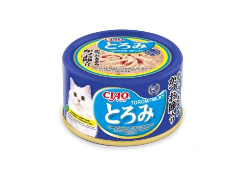 Inaba Ciao Toromi Milky Консервы Инаба для кошек Магуро и куриное филе с кацуобуси в овсяном молоке (цена за упаковку) 80г х 24шт