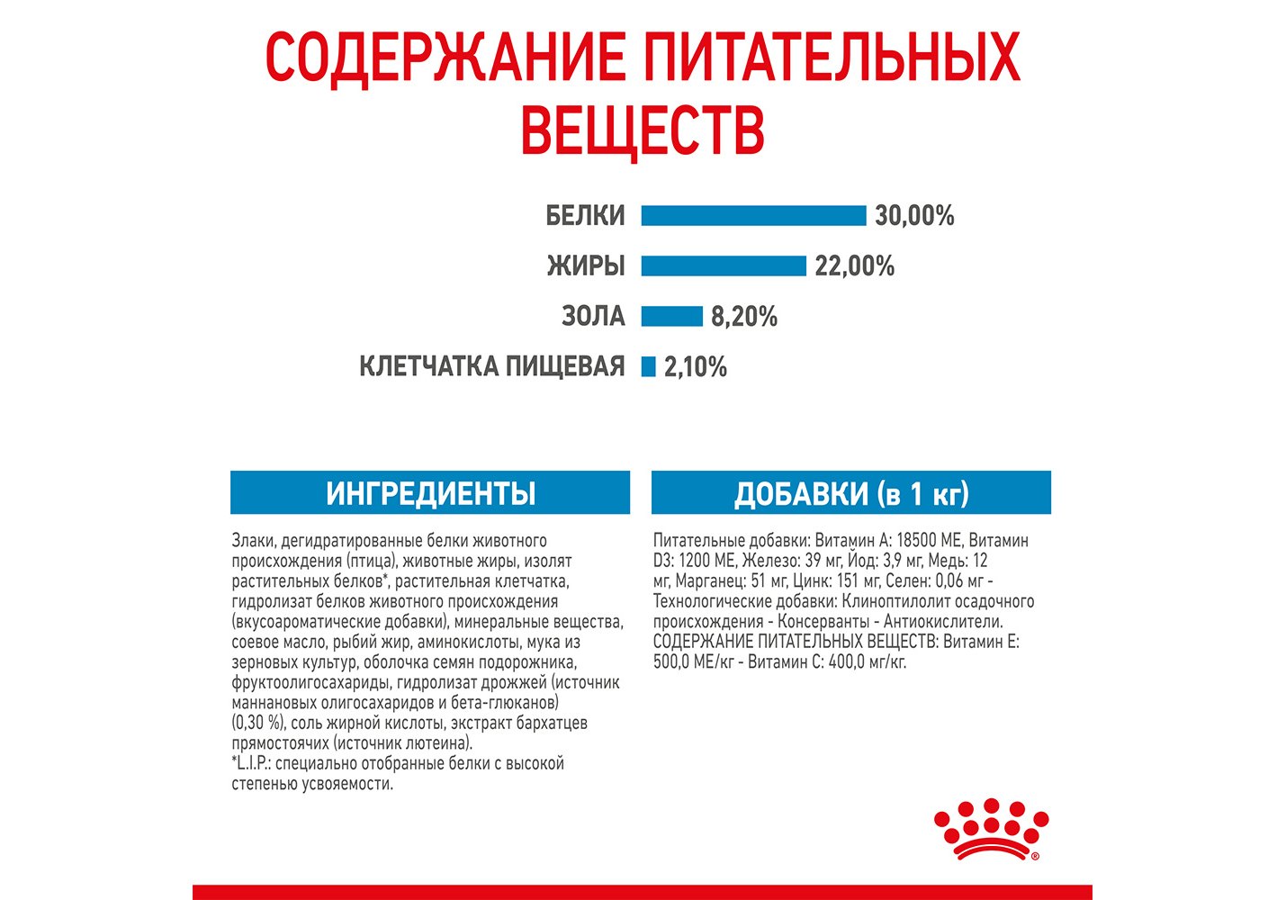 Рис, дегидратированные белки животного происхождения (птица), животные жиры, изолят растительных белков*, растительная клетчатка, пшеница, гидролизат белков животного происхождения (вкусоароматические добавки), минеральные вещества, соевое масло, рыбий жир, оболочка и семена подорожника, фруктоолигосахариды, гидролизат дрожжей (источник мaннановых олигосахаридов), соль жирной кислоты, экстракты дрожжей (источник бета-глюканов), экстракт бархатцев прямостоячих (источник лютеина).