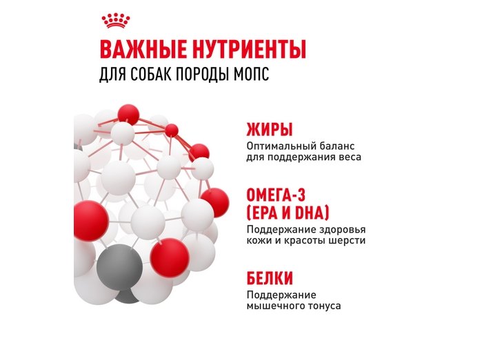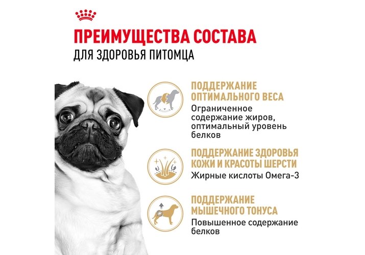 Корм ROYAL CANIN® Pug Adult, предназначенный для собак породы мопс старше 10 месяцев, специально разработан с учетом уникальных потребностей вашей взрослой собаки в питательных веществах.
