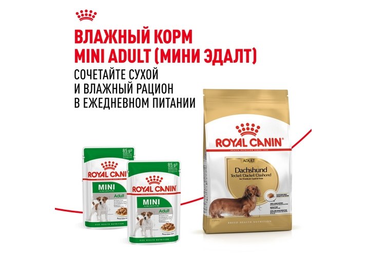 Для удовлетворения индивидуальных предпочтений каждой собаки ROYAL CANIN® Dachshund Adult выпускается также в виде влажного корма – в форме нежного и вкусного паштета.