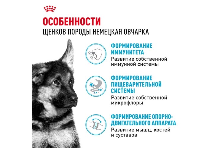 Формула сухого продукта ROYAL CANIN® German Shepherd Puppy (НЕМЕЦКАЯ ОВЧАРКА ПАППИ) поддерживает развитие иммунной системы, здоровое пищеварение и здоровье костей и суставов.