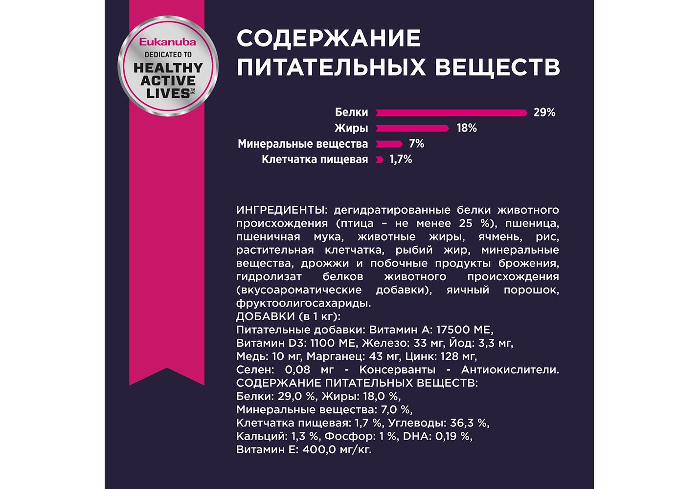 Белки 29%; жиры 18%; минеральные вещества 7%; клетчатка 1,7%; углеводы 36,3%; DHA (ДГК) 0,19%; кальций 1,3%; фосфор 1,%; витамин E 400,0 мг/кг.