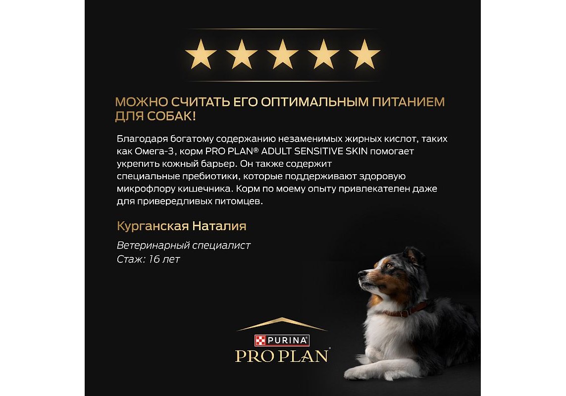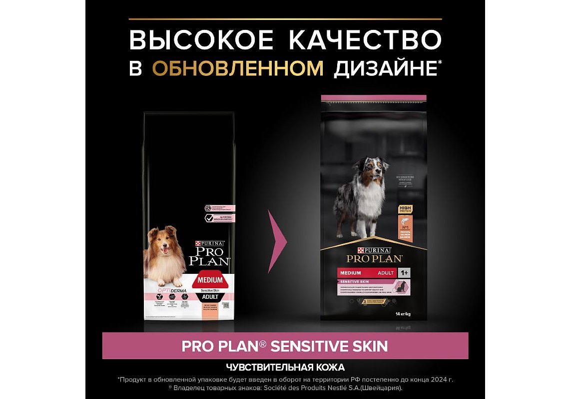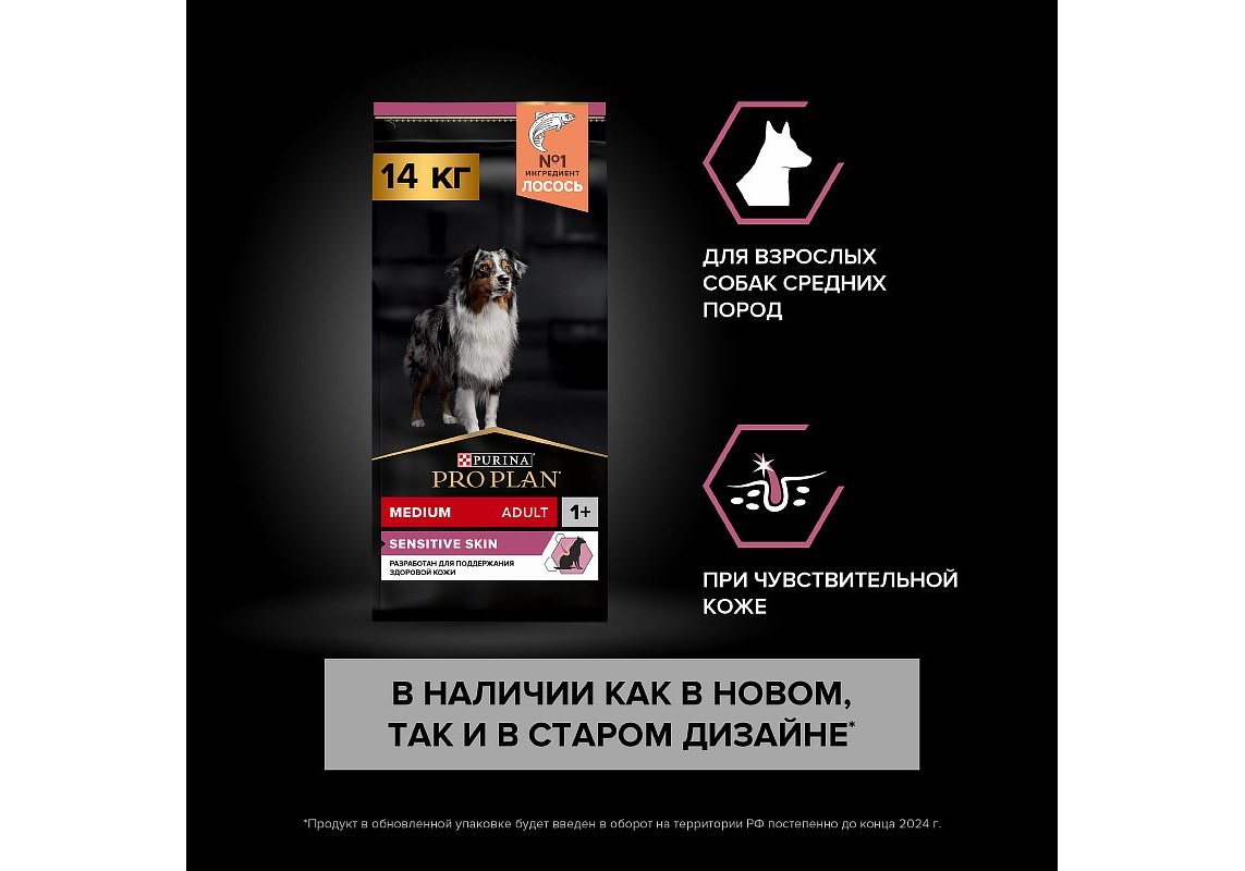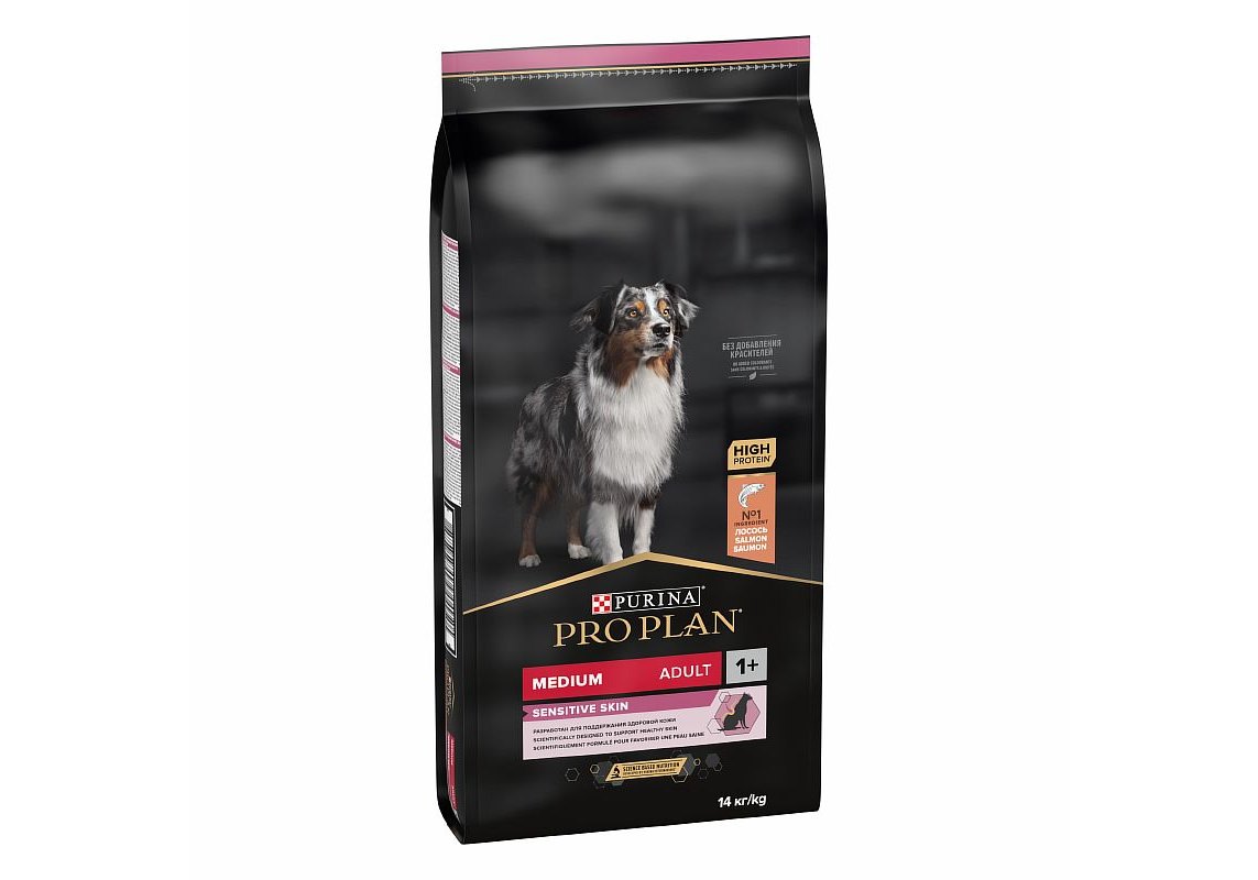 Изучая потребности собак на протяжении многих лет, команда квалифицированных ветеринарных специалистов и диетологов PURINA разработала сухой корм PRO PLAN® Sensitive skin (для чувствительной кожи) — ежедневный рацион с высоким содержанием лосося для взрослых собак средних пород. Этот полнорационный корм сбалансирован по составу и помогает поддерживать здоровье чувствительной кожи.