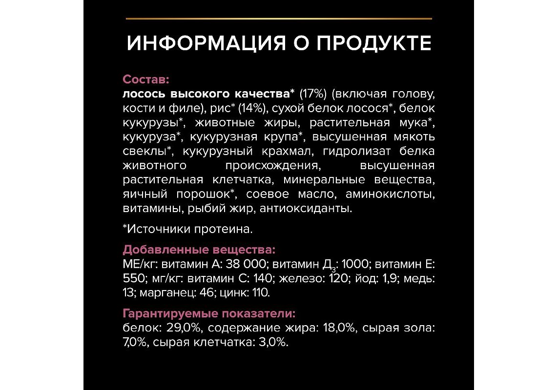 Лосось высокого качества* (17%) (включая голову, кости и филе), рис* (14%), сухой белок лосося*, белок кукурузы*, животные жиры, растительная мука*, кукуруза*, кукурузная крупа*, высушенная мякоть свеклы*, кукурузный крахмал, гидролизат белка животного происхождения, высушенная растительная клетчатка, минеральные вещества, яичный порошок*, соевое масло, аминокислоты, витамины, рыбий жир, антиоксиданты.
