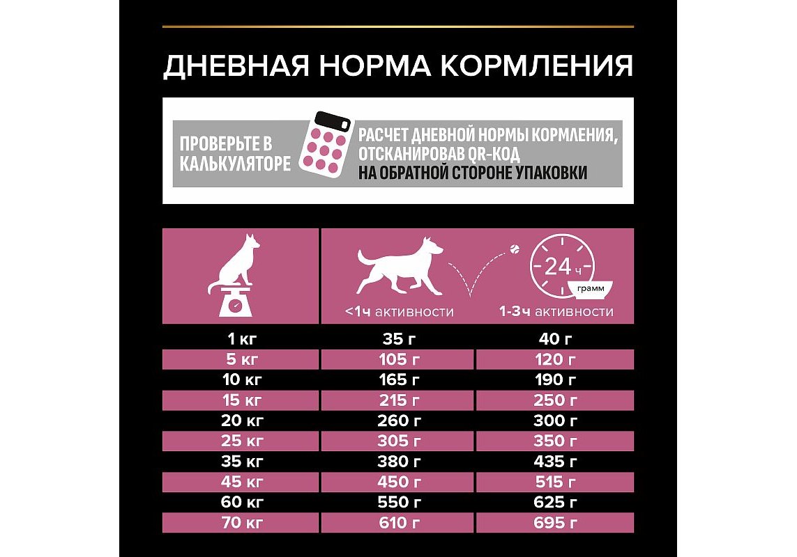 Используйте таблицу для определения суточной нормы кормления вашей собаки. Указанные нормы рекомендованы для поддержания собаки в оптимальной физической форме. Меняйте суточную норму кормления в зависимости от уровня активности собаки, ее физических особенностей и индивидуальных потребностей. Следите, чтобы у собаки всегда была чистая, свежая питьевая вода. Для контроля здоровья вашей собаки обращайтесь в ветеринарную клинику на регулярной основе.