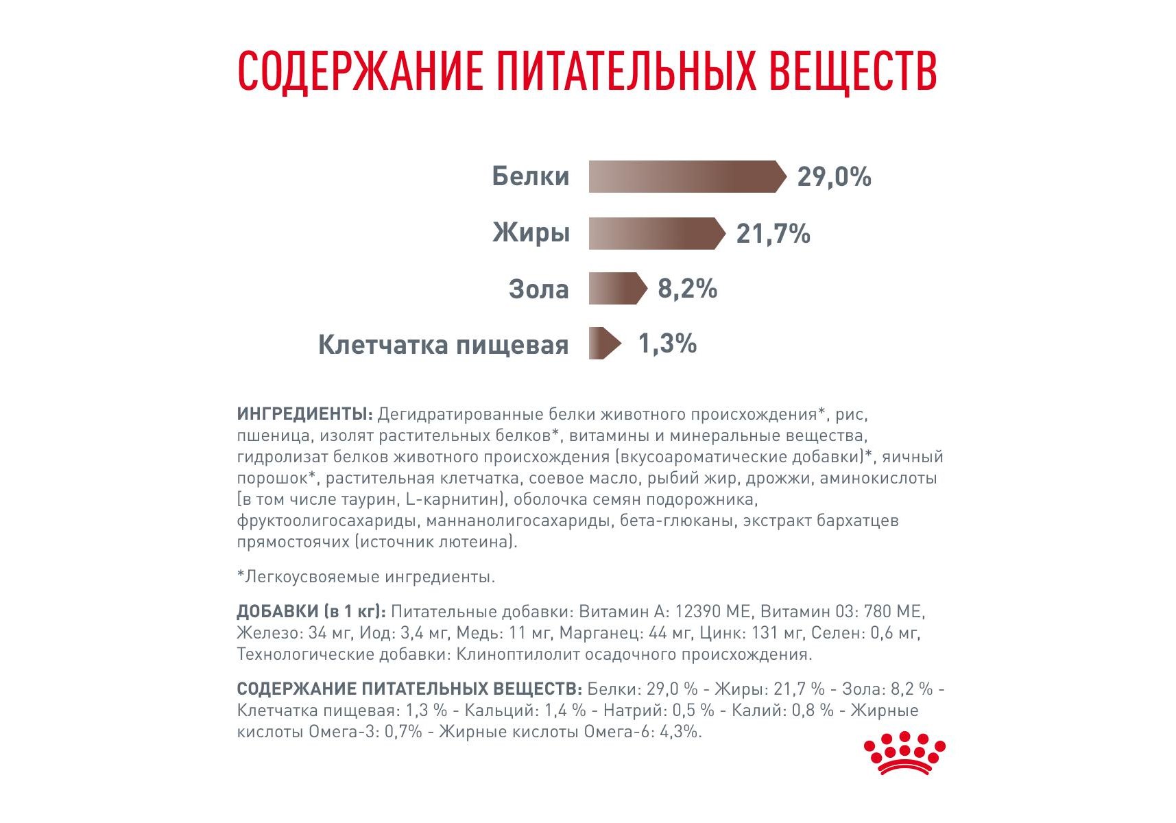 Рис*, дегидратированные белки животного происхождения (птица)*, животные жиры*, кукуруза*, дегидратированные белки животного происхождения (свинина)*, пшеничная клейковина*, свекольный жом, гидролизат белков животного происхождения (вкусоароматические добавки)*, минеральные вещества, яичный порошок*, соевое масло*, рыбий жир*, продукты переработки дрожжей, оболочки и семена подорожника (источник растительной слизи), фруктоолигосахариды (0,5%), гидролизат дрожжей (источник мaннановых олигосахаридов (0,2%) и бета-глюканов), экстракт бархатцев прямостоячих (источник лютеина).