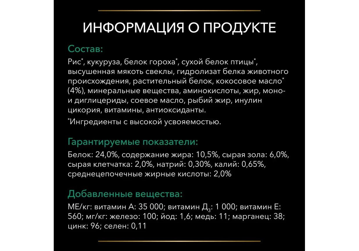 Рис*, кукуруза, кукурузный глютен*, сухой белок птицы*, вкусоароматическая кормовая добавка, высушенная мякоть свеклы, концентрат белка гороха*, минеральные вещества, кокосовое масло* (4%), аминокислоты, животный жир, моно- и диглицериды, соевое масло, рыбий жир, инулин, витамины, антиоксиданты.