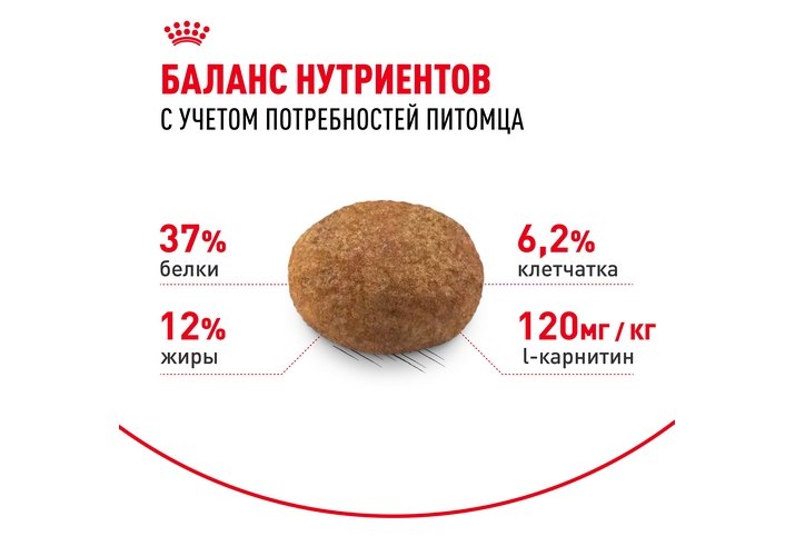 Помогает поддерживать оптимальный вес благодаря ограниченному содержанию жиров, оптимальному уровню белков и входящему в состав корма L-карнитину.