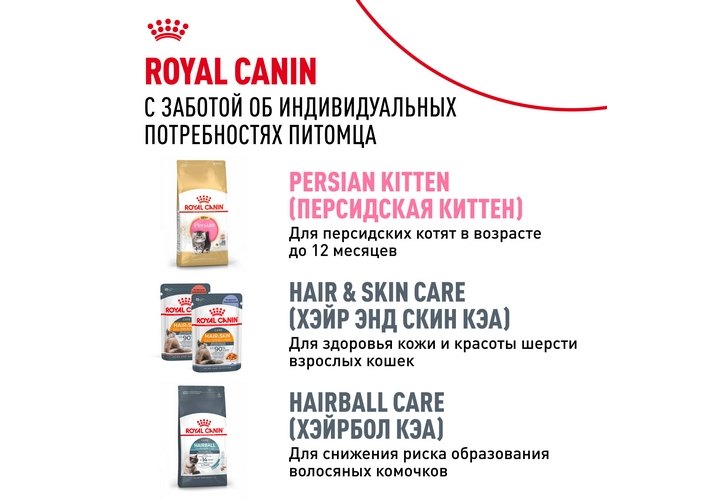 Из-за длинной шерсти персидские кошки склонны к образованию волосяных комочков в пищеварительном тракте, что может причинять животным дискомфорт. Однако при питании ROYAL CANIN® Persian Adult проглоченная шерсть легко выводится из организма, вероятность образования комочков сводится к минимуму, а кишечный транзит стимулируется естественным образом – благодаря комплексу различных видов клетчатки (в том числе семени подорожника с высоким содержанием растительной слизи).