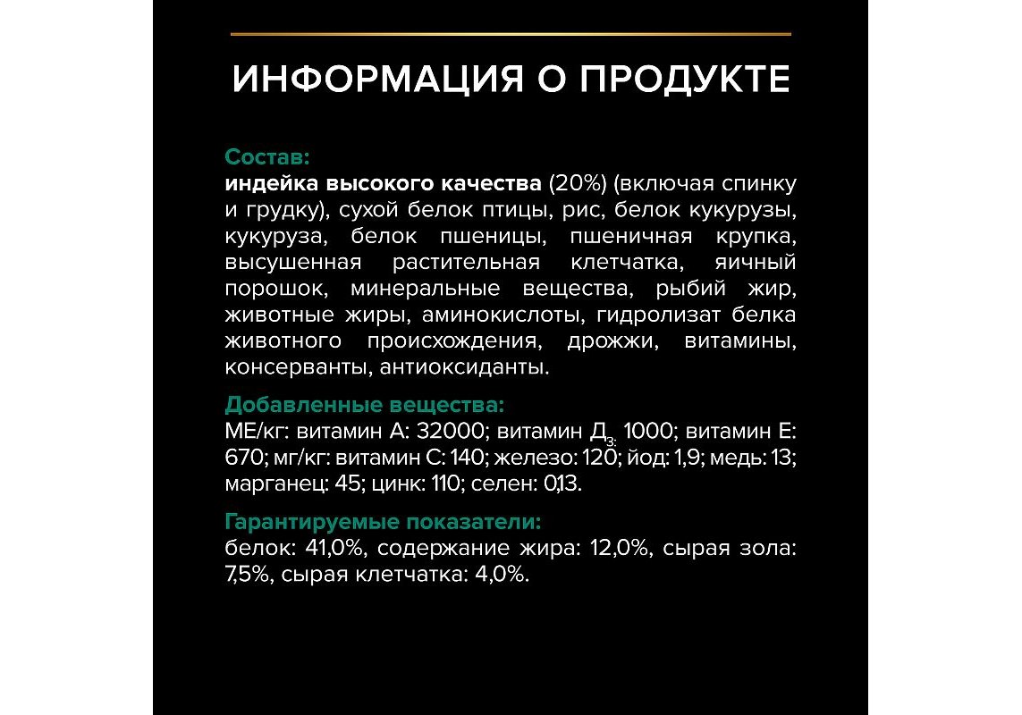 Индейка высокого качества (включая спинку и грудку) (20%), сухой белок птицы, рис, белок пшеницы, соевый белок (без буквы) или белок кукурузы (буква - Х) (смотрите букву в строке срока годности), кукуруза, пшеничная крупка, высушенная мякоть свеклы, животные жиры, яичный порошок, рыбий жир, минеральные вещества, концентрат белка гороха, аминокислоты, гидролизат белка животного происхождения, дрожжи, консерванты, витамины, антиоксиданты.