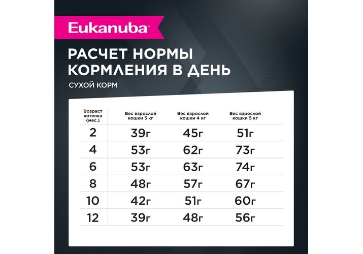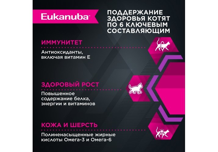 Корм Eukanuba для котят содержит докозагексаеновую кислоту, способствующую правильному развитию мозга котят.