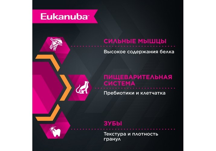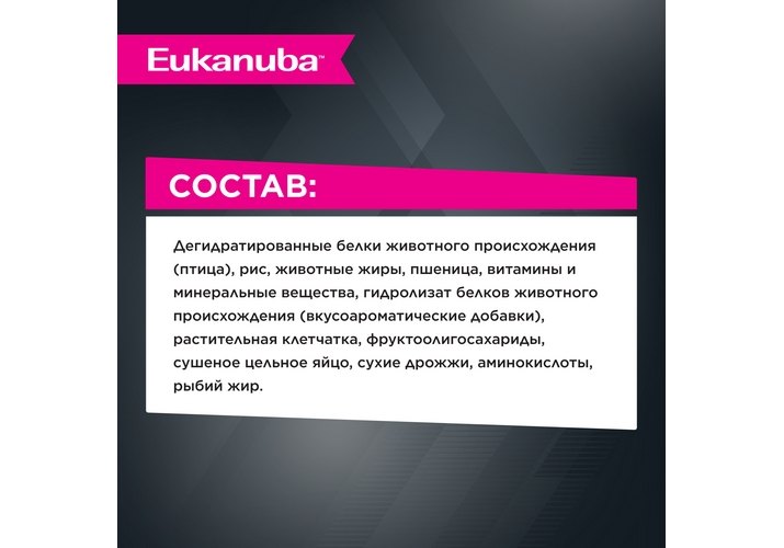 Животные белки – преимущественно курицы или ягнёнка – ингредиент №1 в составе рационов Eukanuba. Также рецептура кормов отличается особым соотношением жирных кислот Омега-6 и Омега-3 (DHA), специальным сочетанием различных источников углеводов, высоким уровнем содержания антиоксидантов, клетчатки, L-карнитина и веществ, препятствующих образованию зубного камня (комплекс 3D DentaDefence).