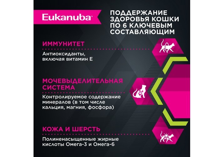 Владельцы кошек, живущих в помещении, часто сталкиваются с проблемами, которые возникают у кошек при нарушении естественного выведении комочков шерсти из организма. Специальная формула профессионального рациона Eukanuba™ для взрослых кошек, живущих в помещении, содержит клетчатку, способствующую выведению комочков шерсти через пищеварительную систему. Благодаря этому дискомфорт для кошки снизится, а специальная формула с пребиотиками обеспечит здоровую кишечную микрофлору.