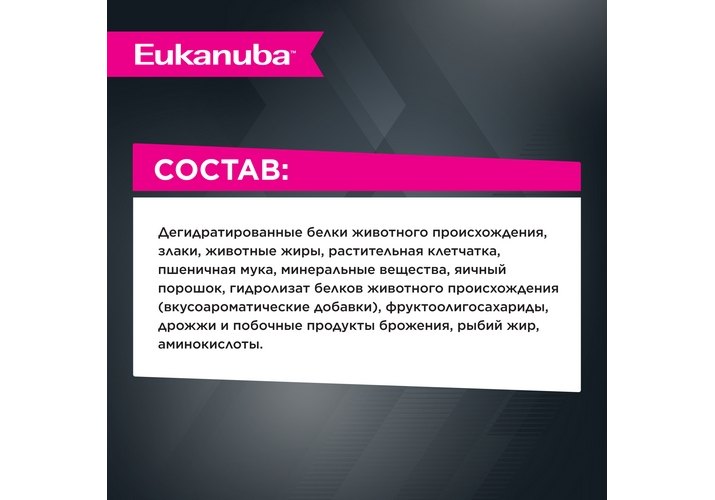 Животные белки – преимущественно курицы или ягнёнка – ингредиент №1 в составе рационов Eukanuba. Также рецептура кормов отличается особым соотношением жирных кислот Омега-6 и Омега-3 (DHA), специальным сочетанием различных источников углеводов, высоким уровнем содержания антиоксидантов, клетчатки, L-карнитина и веществ, препятствующих образованию зубного камня (комплекс 3D DentaDefence).