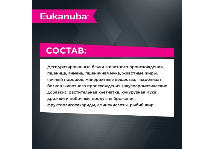 Животные белки – преимущественно курицы или ягнёнка – ингредиент №1 в составе рационов Eukanuba. Также рецептура кормов отличается особым соотношением жирных кислот Омега-6 и Омега-3 (DHA), специальным сочетанием различных источников углеводов, высоким уровнем содержания антиоксидантов, клетчатки, L-карнитина и веществ, препятствующих образованию зубного камня (комплекс 3D DentaDefence).