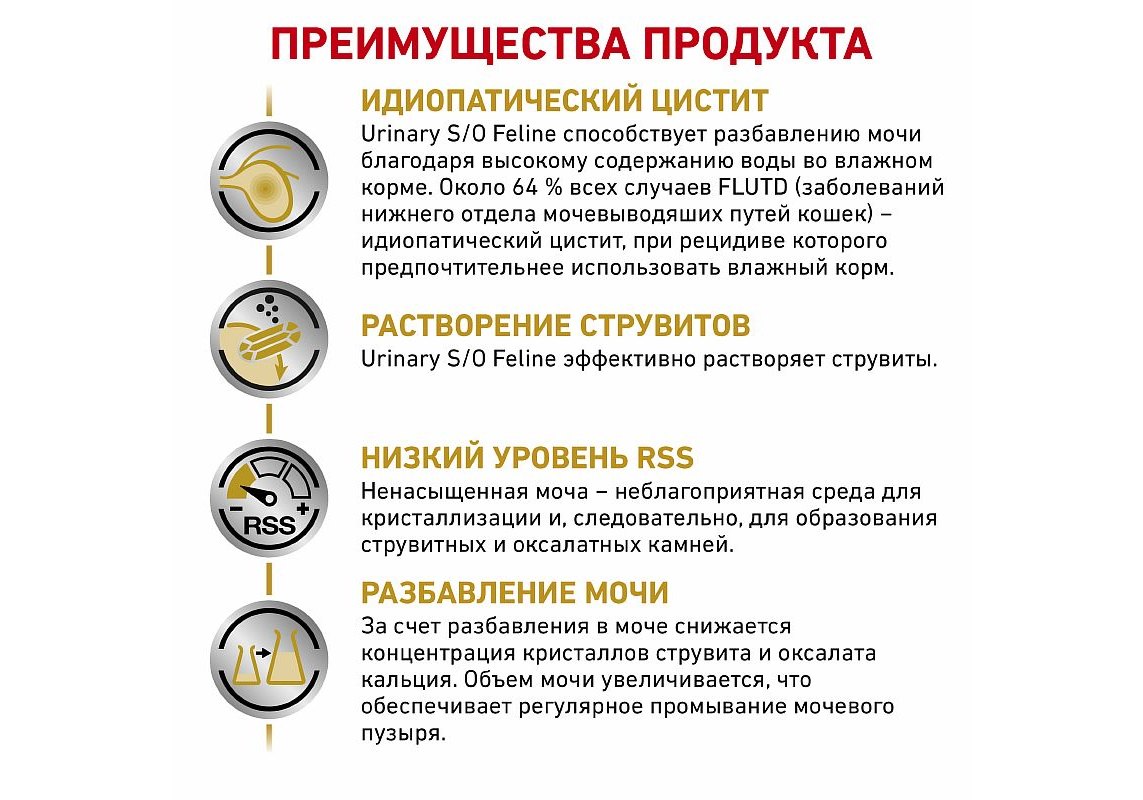 Корм консервированный полнорационный диетический для взрослых кошек URINARY S/O (УРИНАРИ С/О), мелкие кусочки в соусе. Способствует растворению всех типов струвитных мочевых камней и снижает риск их повторного образования за счет подкисления мочи и низкого содержания магния - одной из составляющих кристаллов струвита. Снижает концентрацию ионов, участвующих в формировании конкрементов в моче. Способствует разбавлению мочи и снижает риск образования кристаллов струвита и оксалата кальция.