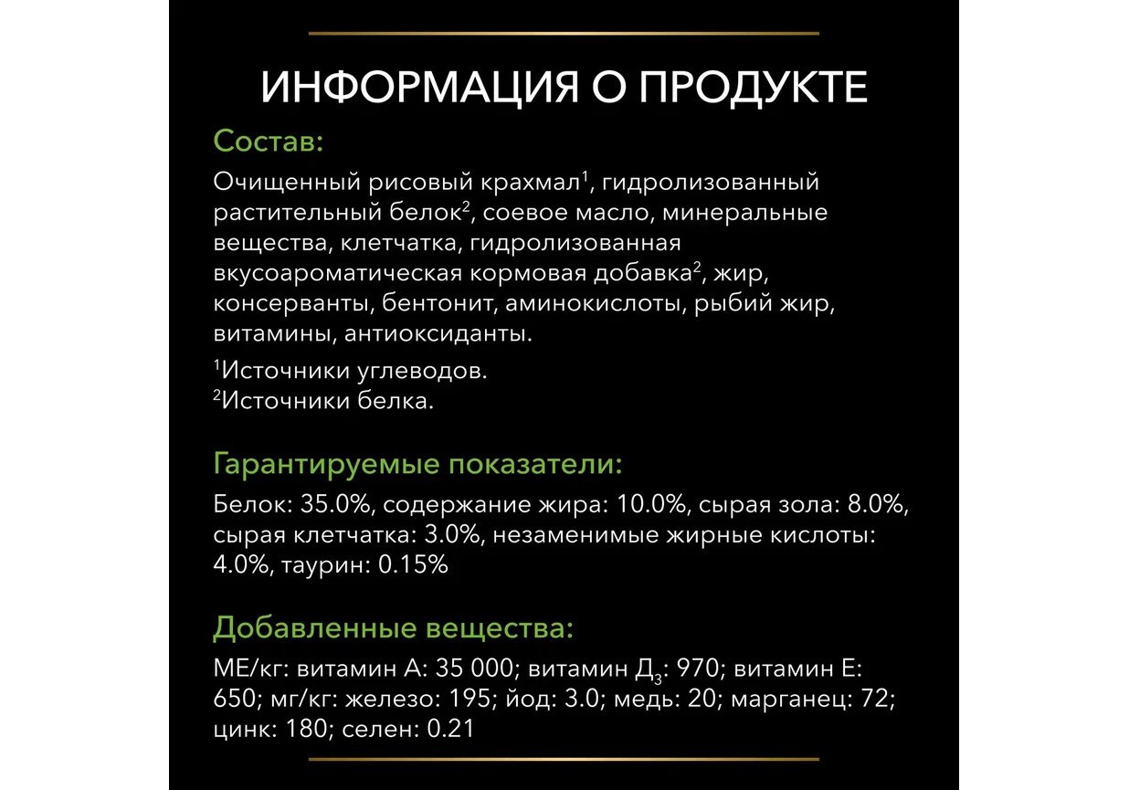 Очищенный рисовый крахмал1, гидролизованный растительный белок2, соевое масло, минеральные вещества, клетчатка, гидролизованная вкусоароматическая кормовая добавка2, жир, консерванты, бентонит, аминокислоты, рыбий жир, витамины, антиоксиданты.