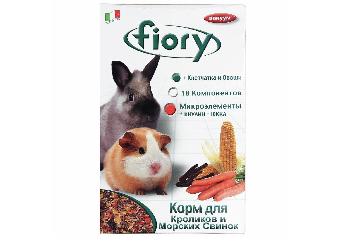 FIORY смесь для свинок и кроликов. Смесь состоит из полезных зерен, цельного и очищенного овса, моркови, свеклы, ячменя, плодов рожкового дерева, кукурузных хлопьев и специальных гранул, обогащенных минералами, витаминами и другими полезными веществами (юкка, органический селен, инулин и др.), обеспечивающими здоровое функционирование организма вашего питомца.