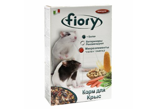 FIORY смесь для крыс. Смесь специально разработана для домашних крыс. Для обеспечения разнообразной и сбалансированной диеты, были включены продукты, которые по своим характеристикам, помимо того, что обеспечивают полноценный ежедневный рацион, превращают процесс питания в требующее времени занятие. Сбалансированное питание – залог прекрасного самочувствия, здоровья и прекрасного внешнего вида домашней крысы. Корм содержит крокетки, зерновые, фрукты и овощи, арахис, морковь и горох, которые обогащают организм крысы необходимыми элементами, дают ей энергию и силу. Кроме того, смесь обладает потрясающим вкусом и ароматом.