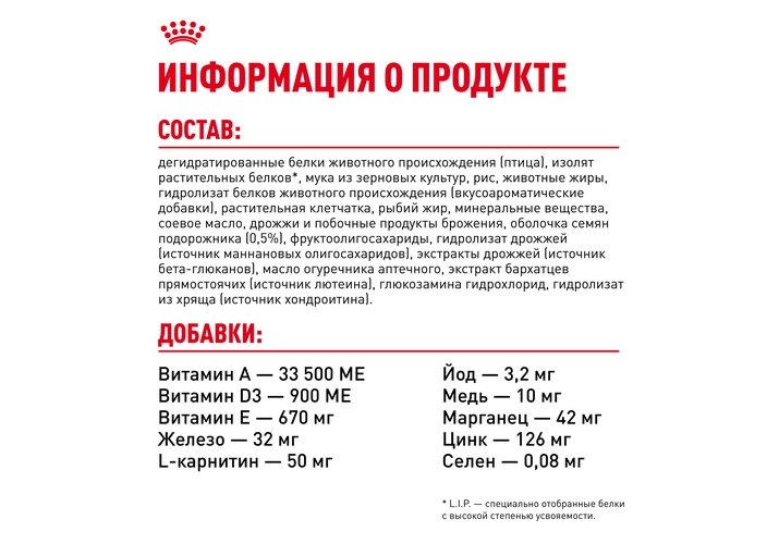 Дегидратированные белки животного происхождения (птица), изолят растительных белков*, мука из зерновых культур, рис, животные жиры, гидролизат белков животного происхождения (вкусоароматические добавки), растительная клетчатка, рыбий жир, минеральные вещества, соевое масло, дрожжи и побочные продукты брожения, оболочки и семена подорожника (0,5%), фруктоолигосахариды, гидролизат дрожжей (источник мaннановых олигосахаридов), экстракты дрожжей (источник бета-глюканов), масло огуречника аптечного, экстракт бархатцев прямостоячих (источник лютеина), гидролизат из панциря ракообразных (источник глюкозамина), гидролизат из хряща (источник хондроитина).
