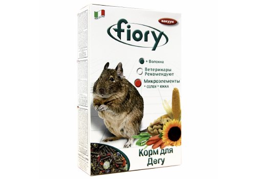 FIORY корм для дегу (Южно-Американские грызуны). Смесь содержит очень большое количество трав, сена, коры, волокнистого сырья, для того, чтобы лучше соответствовать правильным пищевым потребностям дегу. В смесь добавлены некоторые виды овощей, такие, как свекла, морковь и горох. В небольшом количестве, чтобы не превысить допустимую норму жиров, в смесь добавлены арахис и семена подсолнечника. Дополнительные преимущества смеси это добавление гранул, которые содержат: