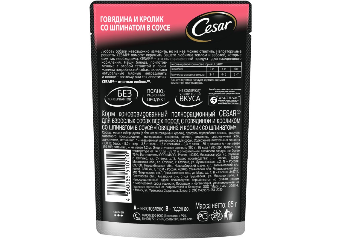 Рекомендуемое количество корма CESAR® (вес животного, кг – упаковок корма в сутки, шт): 3 кг – 3-4; 4 кг – 4-5; 6 кг – 6-7. Вашего питомца следует кормить кормом комнатной температуры.