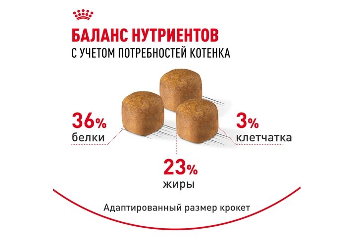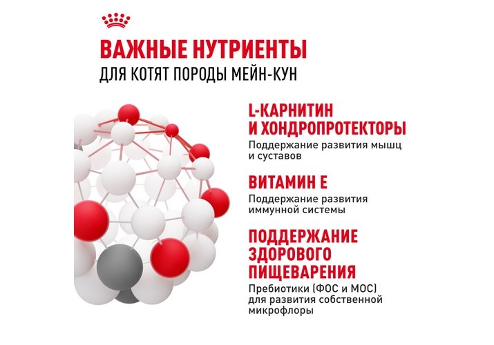 Долгий период роста котят породы Мейн Кун обеспечивает формирование свойственного для этой породы мощного сложения. Содержит необходимое количество калорий, белков, витаминов (в том числе витамина D) и минералов (в том числе кальция и фосфора), обеспечивающих гармоничный рост и здоровое развитие костей и суставов.