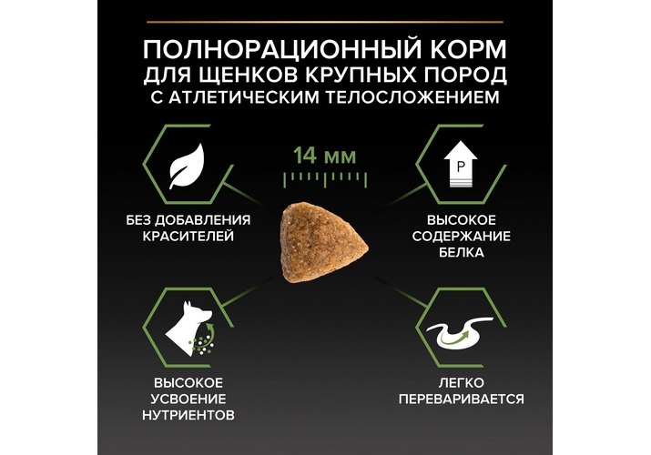 • Специальная рецептура для щенков крупных пород с атлетическим телосложением помогает поддерживать здоровье суставов вашего щенка при активном образе жизни.