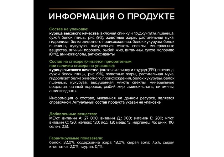 Состав на стикере (считается приоритетным при наличии стикера на упаковке): Курица высокого качества (включая спинку и грудку) (19%), пшеница, сухой белок птицы, рис (9%), животные жиры, растительная мука, гидролизат белка животного происхождения, белок кукурузы, белок.