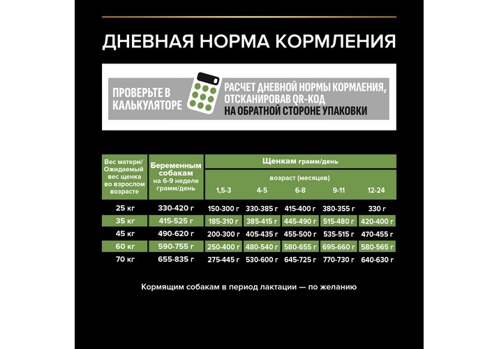 После полного прекращения кормления материнским молоком кормите согласно таблице. Скорректируйте дневную норму в соответствии с активностью вашей собаки, физическим состоянием и индивидуальными потребностями. Следите, чтобы у собаки всегда была чистая, свежая питьевая вода. Для контроля здоровья вашей собаки обращайтесь в ветеринарную клинику на регулярной основе. При наличии индивидуальных потребностей, щенок может быть переведен на комплекс Pro Plan® OPTIDIGEST® или Pro Plan® OPTIDERMA®.