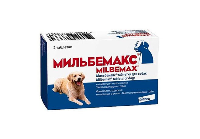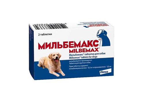 Препарат задается однократно. Рекомендуется применение с профилактической целью."Мильбемакс таблетки для крупных собак" в качестве действующих веществ содержат мильбемицина оксим - 12,5 мг/табл. и празиквантела - 125 мг/табл., а в качестве вспомогательных компонентов: микрокристаллическую целлюлозу - 20%, натрия кроскармелозу - 3%, повидон - 1,5%, лактозы моногидрат - 51,5%, кремний коллоидный и магния стеарат - 2%.