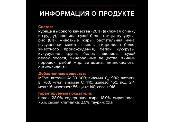 Курица высокого качества (19%) (включая спинку и грудку), пшеница, сухой белок птицы, кукуруза, рис (8%), животные жиры, растительная мука, высушенная мякоть свеклы, гидролизат белка животного происхождения, белок кукурузы, кукурузная крупа, белок пшеницы, сухой белок лосося, минеральные вещества, яичный порошок, рыбий жир, витамины, аминокислоты, антиоксиданты.