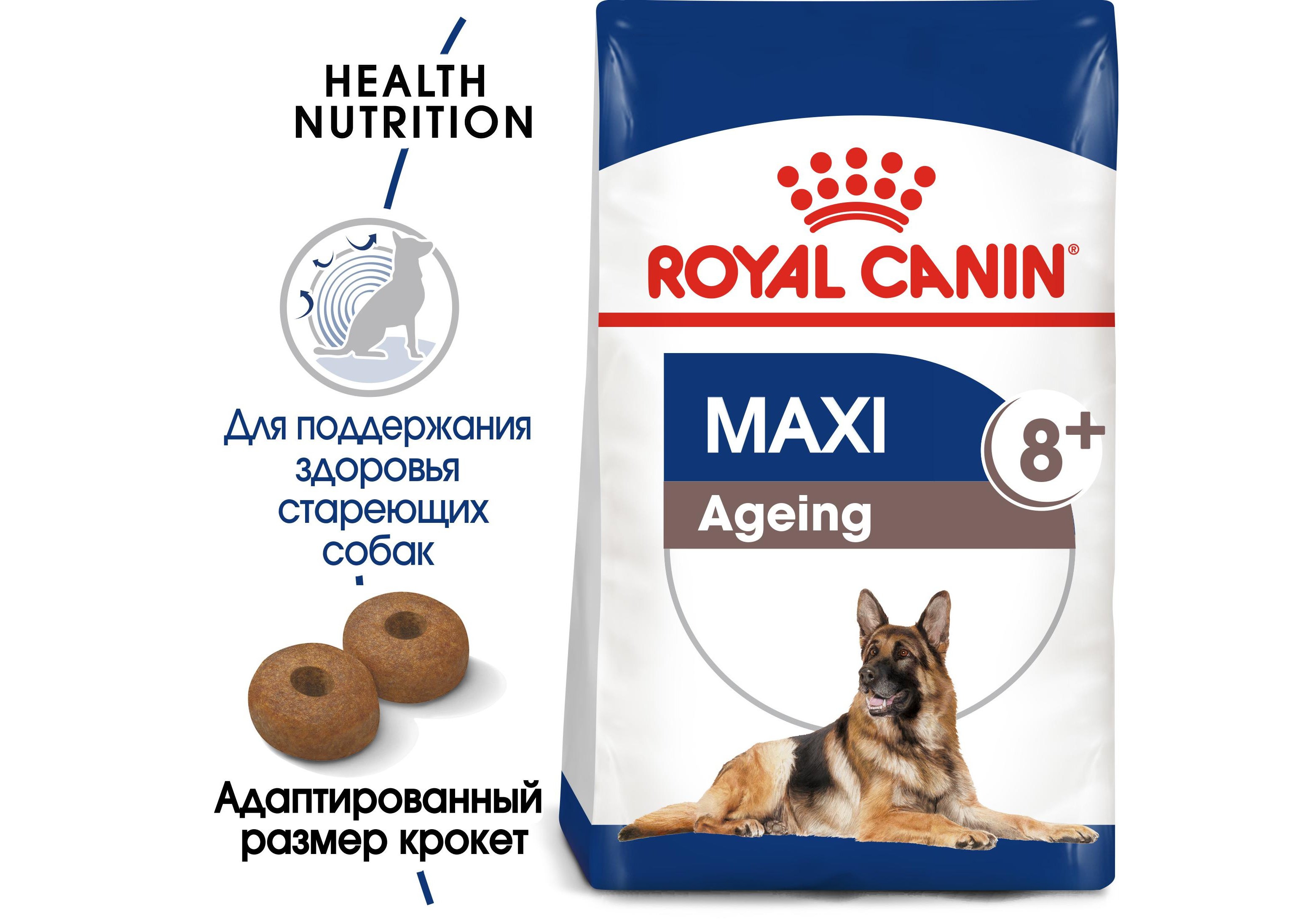 Корм сухой полнорационный для стареющих собак крупных размеров (весом от 26 до 44 кг) в возрасте 8 лет и старше MAXI AGEING 8+ (МАКСИ ЭЙДЖИНГ 8+) ROYAL CANIN®, подходящий для собак крупных пород в возрасте от 8 лет, специально разработан с учетом потребностей вашей собаки в питательных веществах.