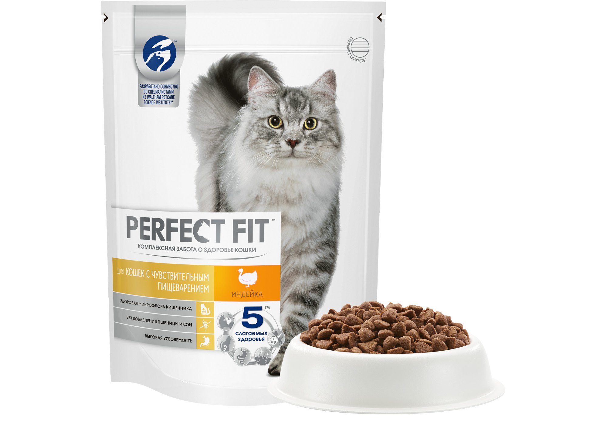 PERFECT FIT™ Sensitive – рацион, адаптированный специально для кошек с особенностями пищеварения. Он содержит пребиотики, способствующие поддержанию здоровой микрофлоры кишечника, и не содержит пшеницы и сои, которые могут вызвать дискомфорт в желудке кошки.