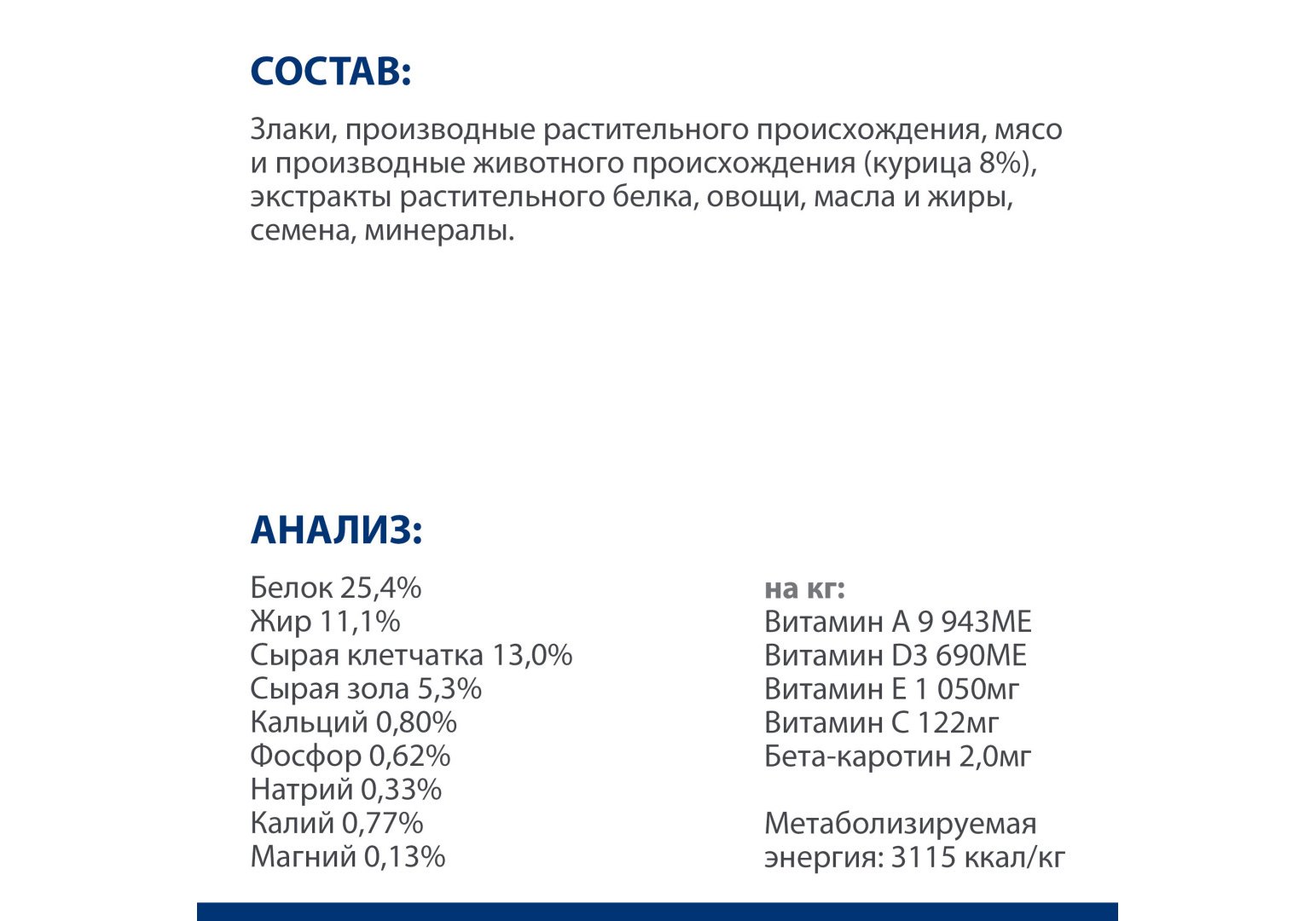 Злаки, производные растительного происхождения, мясо и производные животного происхождения (курица 8%), экстракты растительного белка, овощи, масла и жиры, семена, минералы.