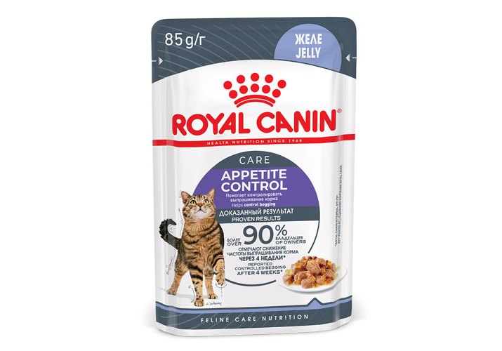 Корм ROYAL CANIN® Appetite Control Care в желе разработан для контроля выпрашивания корма у кошек, предрасположенных к набору лишнего веса, в том числе после стерилизации.